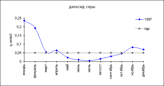 Концентрации диоксида серы. Средняя за год превышала санитарную норму в 1.2 раза. Согласно годового хода среднемесячных концентраций в период с 1993- 1997 г.г. увеличение содержания диоксида серы отмечается в холодные месяцы: январь - апрель и октябрь - декабрь.