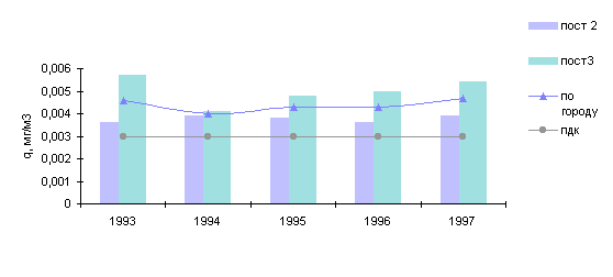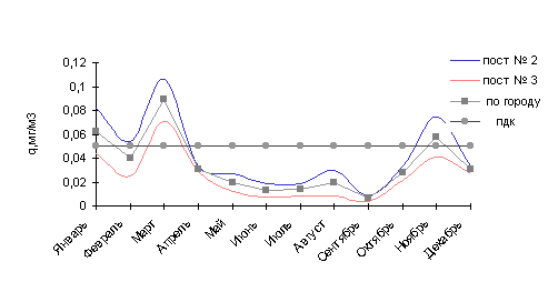 В 1997г. среднемесячные концентрации в городе были выше нормы в 1.6 раза в мае и июле, в 2.8 раза - в июне, а в зимние месяцы - в феврале (1.5 ПДК) и октябре (1.3 ПДК).